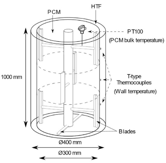 A similar study with a unique LHTES system was conducted by Egea et al. [51]. The authors experimentally analyzed the heat release rate of RT-44HC PCM in a vertical cylindrical LHTES system with the HTF surrounding the PCM container. Three sets of rotating blades were connected to a pipe, which rotated to scrape PCM off the outer wall of the container. The schematic of the system is shown in Figure 6. Rotating speeds of 3, 5, and 7.5 rpm were utilized and compared to a non-scraping mode at 0 rpm. It was determined that the heat release rate is not significantly impacted by an increase in rotational speed. The scraping mode resulted in a 2–3 times higher heat release rate regardless of rotational speed.