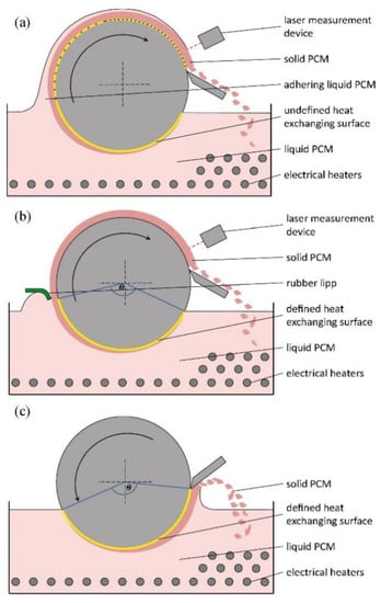 Schematic of system and modes of operation by Tombrink et al. (Copyright 2020 Elsevier) [52]. (a) Scraping off the solidified layer and adhering layer shortly before re-immerge into liquid PCM; (b) scraping off the solidified layer shortly before re-immerge, but removing the adhering liquid layer by a rubber lip shortly after the surface emerged the liquid PCM; (c) scraping off the solidified layer shortly after the surface has emerged from the liquid PCM.