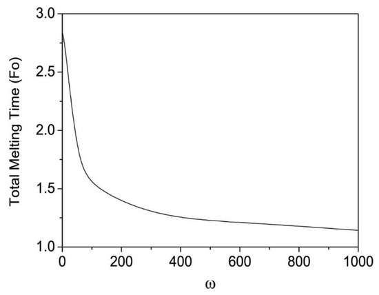 A subsequent numerical study conducted by Zhou et al. [56] analyzed the effects of vibration on the melting of paraffin in a horizontal shell-and-tube LHTES system. Vibration frequencies ranged from 10 to 1000 Hz with vibrational amplitudes from 1.5 to 10 mm. The axis of vibration was tilted away from gravity between 0 and 90°. The study determined that low-frequency vibrations were more effective than high vibrations at decreasing the melting process duration (Figure 9). The static case, 10 Hz, and 1000 Hz melted in 134.3, 35.1, and 56.2 min, respectively. Increasing the amplitude was found to decrease the melting time. The testing conditions of 10 mm amplitude and 10 Hz decreased melting time by 84.7% compared to the static case. Furthermore, the most effective tilt of the vibrational axis was found to be 30° from gravity. The difference in findings between Wu et al. [55] and Zhou et al. [56] shows that the effect of vibration frequency may be dependent on the geometry of the system.