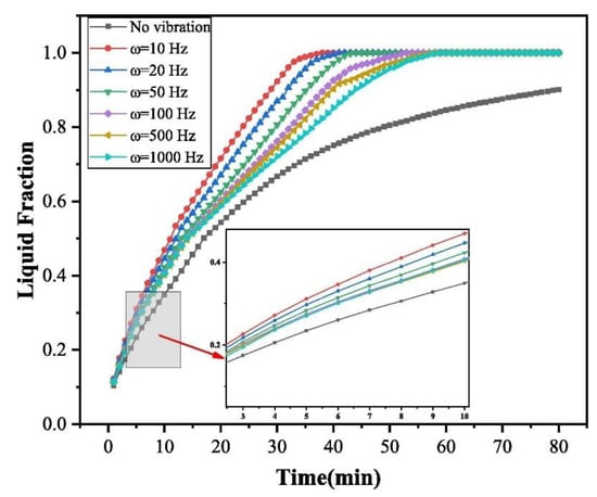 Liquid fraction versus melting time at various vibrational frequencies by Zhou et al. (Copyright 2022 Elsevier) [56].