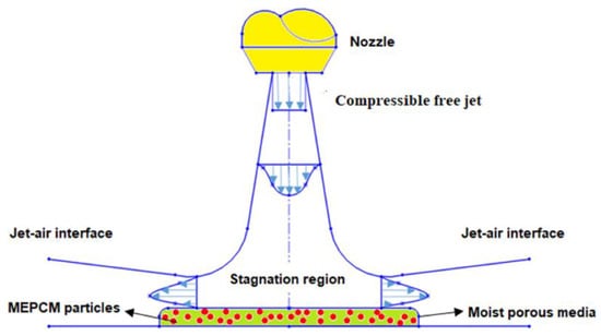 Diagram of impinging air jet on moist porous material with micro-encapsulated PCM by Karami et al. (Copyright 2022 Elsevier) [64].