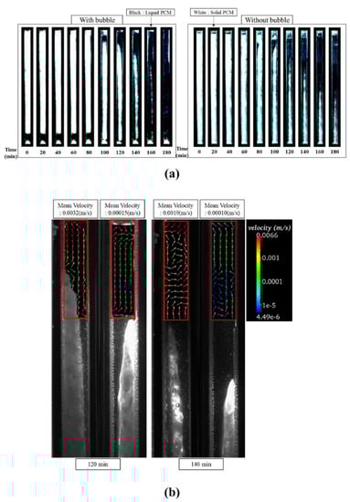 Comparison of PCM melting with and without air bubble injection by Choi et al. (Copyright 2020 Elsevier) [75]. (a) Phase change interface with time; (b) particle image velocimetry results.
