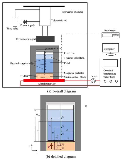 Schematic of LHTES system with alternating magnetic field by Fan et al. (Copyright 2021 Elsevier) [83]. (a) Overall diagram; (b) detailed diagram.