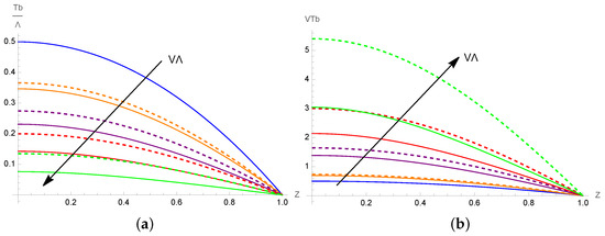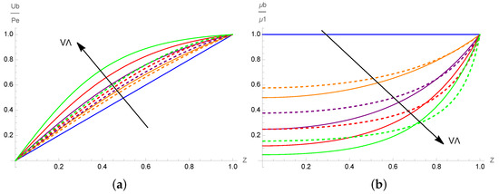 For a fixed value of viscous dissipation Rayleigh number , Figure 1a presents the basic temperature distribution normalized by obtained with the two fluidity models and different values of the product . As seen in this figure, internal heating due to viscous dissipation yields a nonlinear distribution of the base temperature, contrarily to its linear distribution observed in the classical Rayleigh–Bénard configuration, where a temperature difference is imposed on the external walls. Such nonlinear base temperature distribution is due to frictional heating and is also observed in the case of a constant viscosity (). Moreover, it is observed that the fluid layer is cooled as (i.e., V) increases. This means that the increasing variability of the viscosity with a fixed viscous dissipation intensity stabilizes the system. The discrepancies among the two fluidity models increase with and are negligible for .