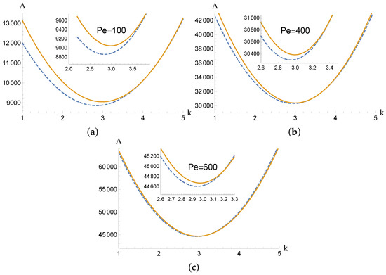 Figure 3a–c shows the neutral curves obtained for transverse rolls with three different values of the Péclet number at . In these figures, solid lines (dashed lines) correspond to neutral stability curves without (with) the approximation . The insets present zooms around critical conditions. As expected, the approximate solution becomes more accurate as increases. Furthermore, a comparison between the critical values in Figure 3a–c, obtained with , and , respectively, shows that the critical value decreases with the decrease in . As according to the Squire transformation, one may therefore conclude that for a fixed , the oblique rolls may develop at the onset of convection at a lower value of the viscous dissipation Rayleigh number (i.e more unstable) than the transverse rolls.