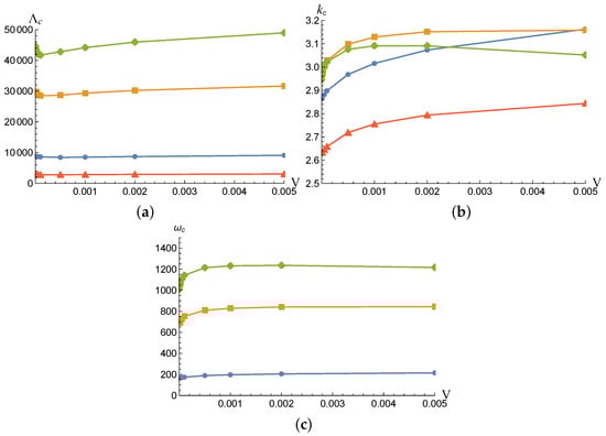 Equations (34)–(39) (or Equations (40)–(43) for LRs) form a generalized eigenvalue problem, which is solved for using a shooting method coded within the software Mathematica [28]. Details about this general shooting methodology can be found elsewhere [29]. The critical condition (, , ) is obtained by minimization of for the fixed values of , V and (or and V for LRs).