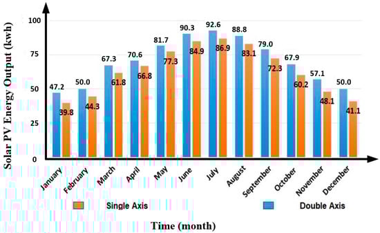 They compared the efficiency obtained from the single-axis solar tracking system and the fixed plate system in their study, where they designed and implemented a dual-axis solar tracker. The results of their study, in which four LDR sensors, Arduino as a microcontroller (controller) and a motor as an actuator are used, contain values parallel to the results of this study. They stated that the solar tracking system has an efficiency difference of 30–40% compared to the fixed systems [37]. In this study, it can be clearly seen that solar tracking systems are more efficient than fixed systems. This result is also supported by literature studies. Considering the application life of the solar energy system, it was emphasized that the financial burden brought by the tracking system to the existing system is not very important. It has been demonstrated by the application data that the single-axis system is 24–25% more efficient than fixed systems and dual -axis system 32–33% more efficient than fixed systems.