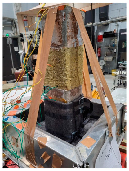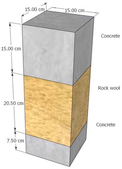 Two bare load-bearing wall samples with sandwich structures were compared to study the thermal performance of the proposed signal-transmissive wall. The one without a 5G antenna was considered as the reference sample, and its general structure is shown in Figure 1. The wall with a section of 15.00 cm × 15.00 cm consisted of a layer of rock wool insulation that was 20.50 cm thick. The two layers of sandwiched concrete were 7.50 cm and 15.00 cm thick, respectively.
