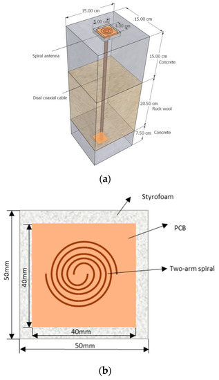 Another sample was the signal-transmissive wall sample, which included an integrated ultrawideband back-to-back spiral antenna system within the sandwiched structure [18]. As illustrated in Figure 2, the antenna system consisted of two identical spiral antennas and a semi-rigid dual coaxial cable, which were installed at the center of the wall. In this sample, the spiral antenna was composed of a copper two-arm spiral, which was 0.035 mm thick and had an outer radius of 17.4 mm and an inner radius of 1.08 mm. The antenna was mounted on a Rogers RT/Duroid 5880 PCB that was 0.5 mm thick and a Styrofoam board that was 10 mm thick. The semi-rigid dual coaxial cable consisted of a rubber block and two coaxial cables. Each coaxial cable comprised a stainless steel outer connector, a PTFE (Teflon) dielectric block, and a stainless steel center connector. The two center connectors were connected to the spiral arms, while the remaining elements of the dual coaxial cable touched the PCBs. The PCB was embedded in the Styrofoam board to the same level as the concrete [19].