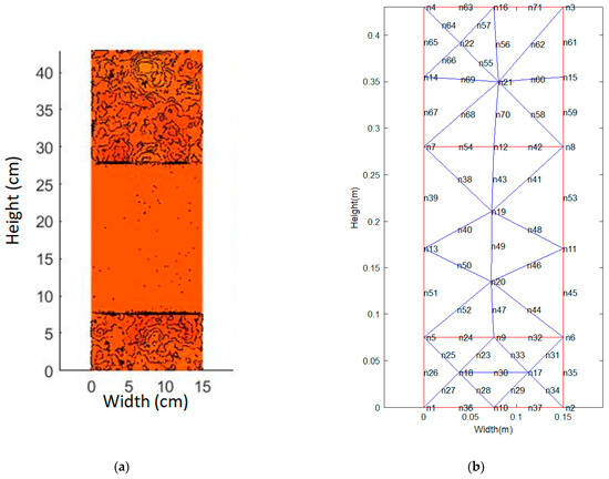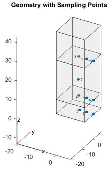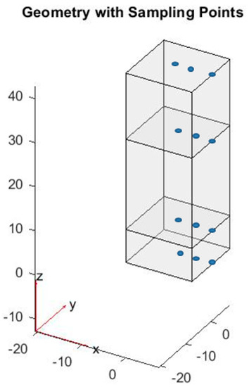 The object of our work was to compare the thermal conductivities of these two samples to obtain the thermal properties of the signal-transmissive wall. Therefore, we compared their thermal performances by analyzing temperature profiles with the cooling temperature −5 °C at the sample bottoms. There were 12 sampling points located at the bottom, two layer intersections, and the top of the samples, as illustrated in Figure 4. Two data loggers, Hioki LR8431-20 (range of measurements: −200 °C to 2000 °C, max. resolution: 0.1 °C and accuracy: ±0.5 °C) and Pico TC-08 (range of measurements: −250 °C to 1370 °C, max. resolution: 0.025 °C and accuracy: ±0.5 °C), were employed to acquire the temperatures at these sampling points. Because we aimed at comparing the performance of heat transfer, the positions of the sampling points were the same in both the reference and the signal-transmissive wall models.