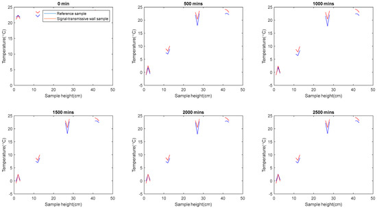 The thermal data indicated that the trigger time was 22 November 2022, at 4:11:03 P.M. The measurement results obtained at 0, 500, 1000, 1500, 2000, and 2500 min are presented in Figure 5, where the x axis and y axis represent the sample height and temperature, respectively. The temperatures of the sampling points were around 23 °C (room temperature) at the initial state (0 min). However, the lower sampling points experienced rapid temperature changes within 2500 min. For instance, the temperature at the sampling point located at a height of 12.5 cm (the intersection between the first concrete and rock wool layer) decreased from 23 °C at 0 min to 6.2 °C after 500 min and remained at 5.3 °C after 1000 min. The thermal performances of the two samples appeared to be the same with consideration of the ambient temperature differences, which have been verified using the COMSOL in [19]. However, some thermal property parameters of the handmade samples in the laboratory significantly deviated from their theoretical values. For example, the density of rock wool was 140 kg/m3 in theory, while the laboratory measurement value was 56.15 kg/m3. Therefore, it was essential to find the true values of these parameters. To further study the thermal properties, we proposed a new method based on the laboratory measurement results. It will be presented in the next section.