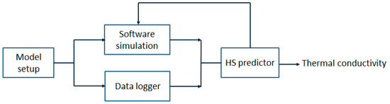 The basic flowchart of our AI-based scheme is shown in Figure 6. In the practical measurement, the bottom concrete was considered as the exterior wall, which was exposed to a low temperature controlled by cooling thermostats. The other faces including the top surface (concrete) were open. As shown in Figure 7, the temperature sampling points were set in the model bottom, two intersections between different materials, and the center of the rock wool. With the temperature data acquired by thermal data logger, an HS-based AI method was developed to find the optimal thermal conductivity values so that the measured temperature profile could match that from the MATLAB simulations.