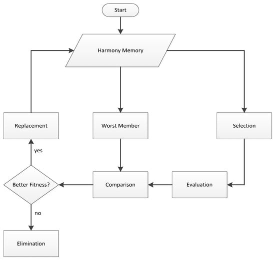 The field of AI has rapidly advanced during the recent years, and it has the potential to revolutionize numerous industries by making processes more efficient, improving decision-making, and enabling new types of products and services [24,25,26]. Actually, AI has been proved to be a powerful tool for optimization problems by analyzing tremendous amounts of data and identifying patterns [27,28]. The HS, inspired by the music improvisation process, is a metaheuristic global optimization method, which has gained great research attention and been widely used to handle different engineering problems [29,30]. When composing harmony, musicians typically experiment with various combinations of musical pitches that they have stored in the memory. This type of efficient search for a perfectly harmonious state is similar to the process used for finding the optimal solutions in engineering. Therefore, harmony improvisation has inspired the emergence of this novel type of Natural Inspired Computation (NIC) algorithm [31], the HS algorithm. Table 3 gives a comparison of the harmony improvisation and the optimization task [32]. Figure 9 shows the flowchart of the HS method involving four main steps as follows.