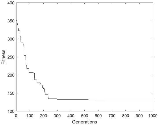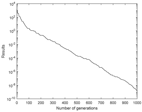 As discussed previously, our measurement method employed the HS optimization algorithm to find the optimal values of the thermal conductivities by minimizing the objective function. The HS method works by iteratively refining the four-dimensional solution until a stopping criterion is met, which can be the qualified solution or a given number of iterations. Due to the characteristics of the HS algorithm, the maximum number of generations, 1000, was chosen as the stop criteria in our simulations. The convergence procedure is illustrated in Figure 11.