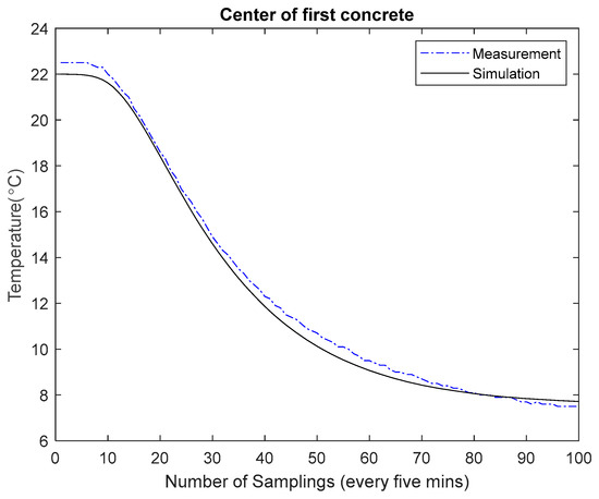 We compared the temperature changes at the center of the intersection between the first concrete and rock wool layer until reaching the steady state, both in the measurement and in the simulations (point 4 in Figure 7). In Figure 12, there are 100 sampling intervals with the duration of 300 s between two intervals. Obviously, the values of the thermal conductivity and specific heat obtained by our proposed method were very close to the actual ones.