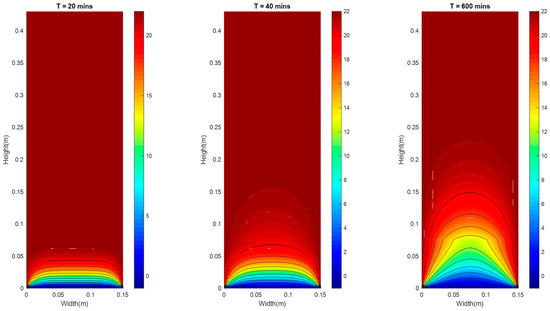 Figure 13 shows the MATLAB simulation of heat transfer based on the thermal property parameters of concrete and rock wool obtained through the proposed HS method (listed in Table 5). The 2D model had a width of 0.15 m, and layer heights were identical to those of the real sample. The temperature at the bottom edge of the model was set to −1 °C, which corresponded to the temperature measured at the bottom of our laboratory sample. The three subplots in Figure 13 illustrate the model temperature changes over the simulation time after 20, 40, and 600 min. Obviously, the temperature of the bottom layer changed rapidly and reached a stable state almost within 20 min, while the rock wool’s good thermal insulation enabled the temperature of the top layer to remain unchanged. This heat transfer simulation by MATLAB was almost consistent with the temperature profile displayed in Figure 5.