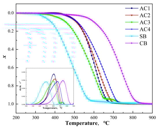 It is evident that the conversion rate curve and the reaction rate curve of CB in the Figure 1 were more tilted towards the high temperature region compared to AC1-4 and SB. CB began to rapidly lose weight at around 560 °C and burned out completely when the temperature reached around 800 °C. Therefore, the characteristic peaks in the reaction rate curves were located in the high-temperature region, and the height was less than that of SB and AC1-4; correspondingly, the low precipitation of volatiles leads to the decrease in the peak width of the characteristic peak of the CB.