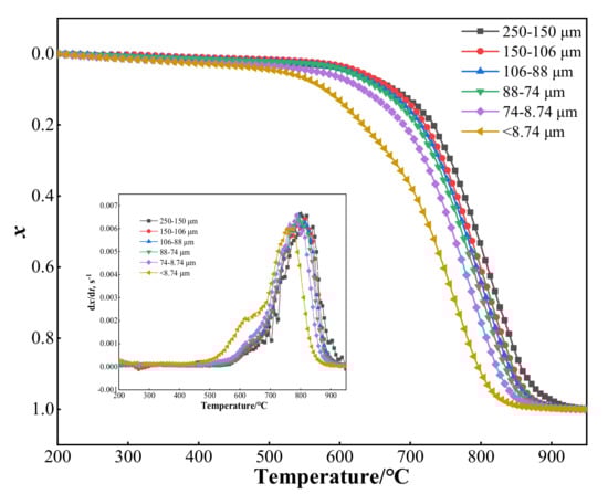 The particle size of pulverized coal is closely related to the combustion performance, and it is an important factor in determining the mass and heat transfer characteristics. Finer particle size of pulverized coal can increase the specific surface area and improve the surface activity, which in turn facilitates oxidation, accelerates the process of temperature transfer from the surface to the interior of the coal, and shortens the end-time of pulverized coal combustion [43]. Combustibility experiments of CB under different particle sizes were conducted to investigate the optimum particle size selection for BFs with injected CB. Six particle sizes were screened after drying the CB: 250–150 μm, 150–106 μm, 106–88 μm, 88–74 μm, 74–8.74 μm and less than 8.74 μm. The experiment conversion rate curves and the reaction rate curves are shown in Figure 2.