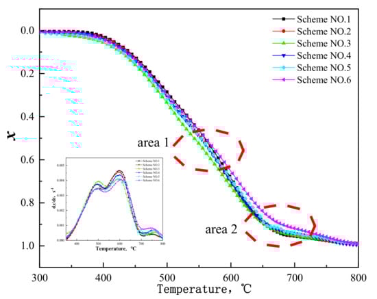 CB, AC1-4 and SB were subjected to combustion experiments with a rate of temperature rise of 20 °C/min. Figure 1 shows their conversion curves and reaction rate curves. Each sample was tested and analyzed under dry conditions, and the temperature range on the horizontal axis was set to 200–900 °C in the conversion curves. The samples combustion conversion curve is similar and can be divided into three main stages; in the first stage, the temperature increases from ambient temperature to 350 °C; as the pulverized coal heats up, moisture and volatile material gradually precipitate out, the pulverized coal loses weight slightly and the rate of reaction gradually increases; in the second stage, at 350–750 °C, both the volatile and the fixed carbon in the sample burn violently with the oxygen in the air, the pulverized coal beings to lose weight rapidly and the peak in reaction rate is reached; the third stage is the burnout step, which occurs at 750–900 °C, the fixed carbon is consumed, and the remaining material is consists primarily of ash [38], the rate-of-conversion curve gradually flattens, and the rate-of-reaction curve falls rapidly. The second stage is the most violent reaction in the pulverized coal combustion process. Therefore, the second stage of the process is the primary object of study.