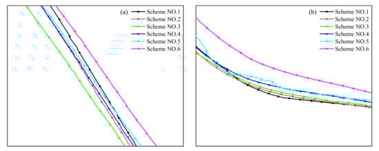 Beginning with a proportion of 6% CB in the blended coal, this proportion was gradually raised to 8%, 10%, and 12%. It can be seen that with the increasing proportion of CB, overall, the trend in the conversion rate curve shifted to the high temperature region. It can be seen from Table 7 that both the Ti and the Tf were increased; this change was consistent with the conclusions obtained from qualitative analysis on conversion rate curves and reaction rate curves. CB had low volatile content and high ash content. Therefore, as the proportion of CB increased, the ash content in the blended coal increased, which hindered the later combustion stage and gradually increased the burnout temperature of the blended coal. The C and the S values were decreased in schemes NO.4 to NO.6. The combustion performance of blended coal worsened, mainly due to the poorer combustion performance of CB than that of other pulverized coal. It also had a greater influence on the combustibility of the blended coal as the proportion of the mixture increased. As the proportion of CB rose above 10%, the combustion performance of the blended coal declined more significantly. For this reason, it is recommended that the proportion of CB should not exceed 10% in practical situations to ensure complete combustion of PCI in the BF, and prevent unburnt coal from entering the dead material column due to insufficient pulverized coal combustion, which may affect the smooth operation of the BF.