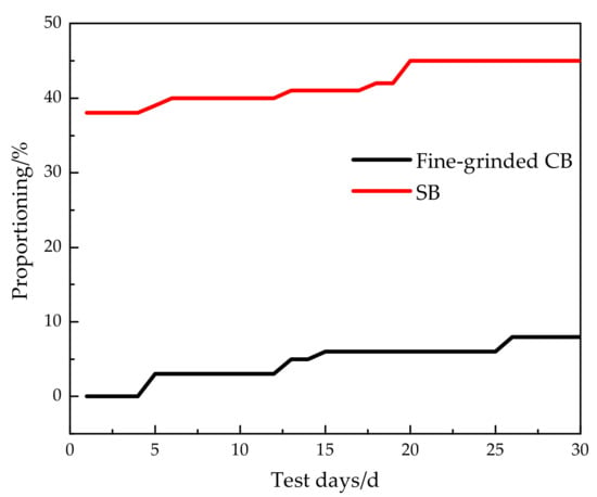 Three BFs (5500 m3) was chosen for industrial testing. In order to investigate the impact of injecting CB on BF production, the tests added CB during the existing coal blending in the ironmaking plant. The base period was the normal production period of the 3 BFs. Based on the above experimental analysis, the tests were carried out in stages. In the first stage, 3% CB was added. In the second stage, 5% CB was added. In the third stage, 6% CB was added, and in the fourth stage, 8% CB. The tests gradually raised the proportion of SB to reduce the detrimental effects of adding CB on the combustion performance of pulverized coal.