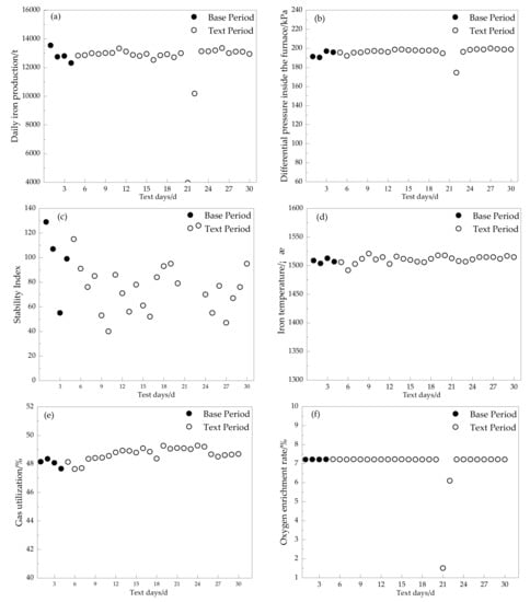 As shown in Figure 5, during the industrial test, the proportion of finely ground CB was gradually increased to 8% and the proportion of SB was increased to 45% in a stepwise manner. By capturing changes in important index parameters during BF production over time, the real impact of increasing the proportion of fine-grinded CB on smelting needs to be understood and adjustments made for later production. The focus is to examine the changes in daily iron production, differential pressure, stability index, iron temperature, gas utilization rate, oxygen enrichment rate, coke ratio and coal ratio under the addition of finely ground CB to the pulverized coal. The specific statistical results are presented in Figure 6 and Figure 7.