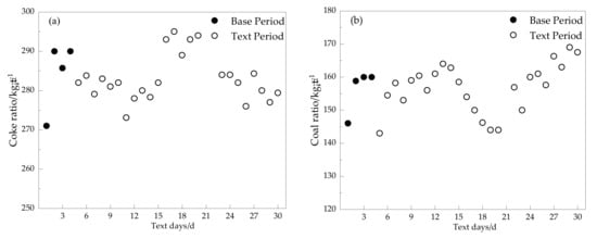 Change of fuel consumption during industrial tests; (a) Coke ratio; (b) Coal ratio.