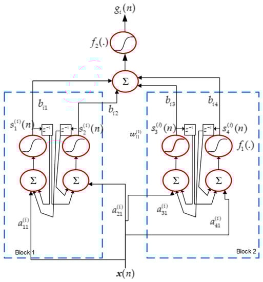 - The consequent parts of the rules are block-diagonal recurrent neural networks. The structure of a two-block BDRNN is presented in Figure 1. The input signal is fed to the blocks of neurons, where each block contains a pair of neurons. There are no connections between neurons that belong to different blocks, while neurons of the same block feedback both to themselves and to each other, with unit delays. This network structure is of a dynamic nature, having internal recurrence (local output feedback, [30]).