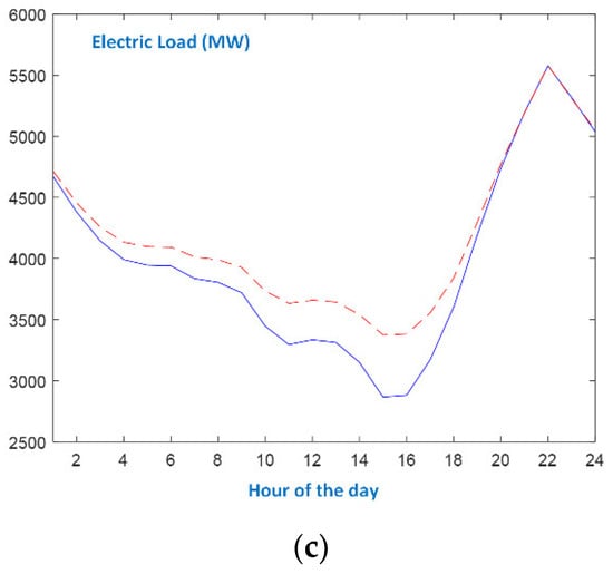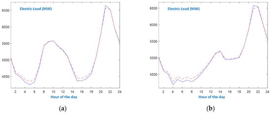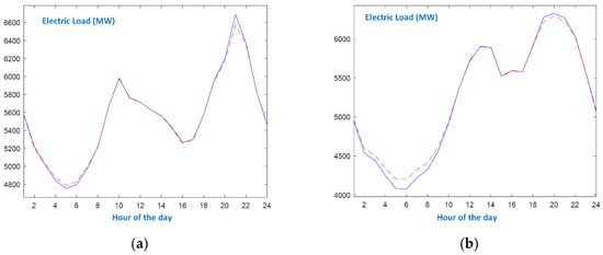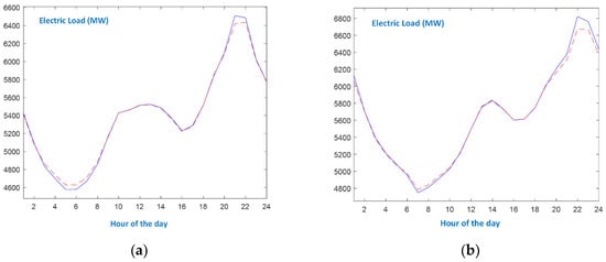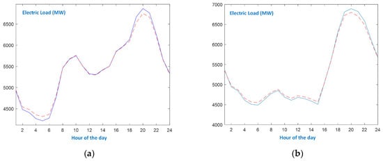 The daily evolution of electric load for weekdays and Sundays, regarding all seasons, is shown in Figure 4, Figure 5, Figure 6 and Figure 7, and a winter week is hosted in Figure 8. Moreover, Figure 9 presents the three major holidays in Greece: Christmas, Orthodox Easter, and Assumption days. In these charts, the blue solid lines are the actual load data series, and the red dashed lines refer to the predictions made by DBD-FELF.