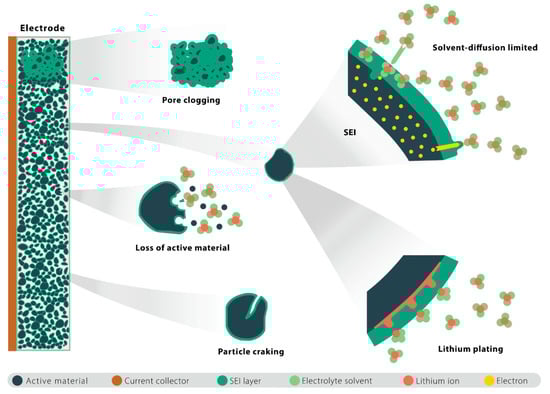 For lithium-ion batteries, multiple external stress factors such as ambient temperature, depth of discharge (DOD), state of charge (SOC) swing range and charging/discharging rate, etc., have a great impact on the electrochemical evolution of different aging mechanisms. The aging behaviors of li-ion batteries under different operating conditions have been studied in many works in the literature. Refs. [,,] show that the high temperature accelerates the side reactions of lithium-ion batteries, especially the solid electrolyte interphase (SEI) layer growth and the loss of active materials (LAMs). The SEI layer breaks down at a temperature above 57 °C, destroying the structural stability of the battery electrode []. During battery charging, refs. [,] demonstrate that a significant amount of li ions accumulate on the anode surface under low temperatures and high charging rates, resulting in a sharp drop in the anode’s potential and, thus, a direct reduction in li ions into lithium metal on the anode surface. Li plating has a great influence on battery performance. Refs. [,] indicate that li plating can lead to the clogging of anode pores, which affects ion transport and thus causes a sharp resistance increase. Refs. [,] reveal that the development of li dendrites on the anode surface has the possibility to puncture the separator, thus resulting in the internal short circuit of the battery. Furthermore, Ref. [] shows that the charging/discharging rate generates high mechanical stress during li-ion lithiation/delithiation, causing the stress fatigue of particles and, thus, particle cracking. Thus, it is important to place batteries in operation under suitable temperatures and charging/discharging rates to suppress these side reactions for extended battery life.