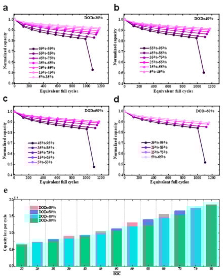 Battery capacity degradation with different DODs and SOC swing ranges. (a) DOD = 30%. (b) DOD = 40%. (c) DOD = 50%. (d) DOD = 60%. (e) Capacity loss per cycle before the ‘knee point’ with different DODs and mean SOC values.