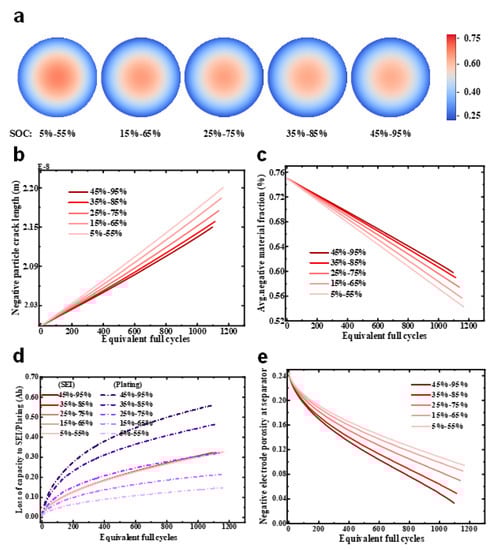Figure 4a depicts the particle concentration distribution on the negative electrode separator side, where the lower the SOC swing range, the higher the particle internal concentration. According to Equations (12) and (13), a higher particle concentration induced larger alternating stress, making active particles more susceptible to fatigue and thus resulting in particle cracking more easily. As shown in Figure 4b, the particle crack length was longer with a lower SOC range, leading to more severe particle cracking. Particle cracking results in the loss of active material (LAM). The LAM of the negative electrode, depicted in Figure 4c, appeared more severe as the SOC cycling range decreased. LAM could lower the interfacial area between the active material and the electrolyte, resulting in an increase in the interfacial current density, which further increases the concentration within the particle and mechanical stress during battery operation. This positive feedback mechanism indirectly accelerates particle cracking.