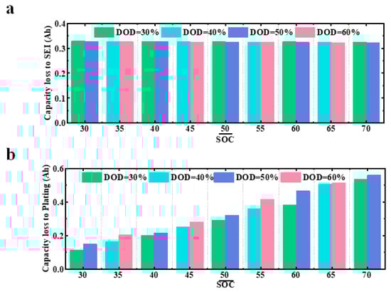 Figure 5 depicts the capacity loss caused by SEI growth and li plating under different DODs and SOC swing ranges. Figure 5a illustrates that the difference in the capacity loss caused by SEI was very small, even with different and DOD values. However, a greater loss in the battery capacity due to li plating was observed (Figure 5b) with higher DODs. Figure 5 indicates that li plating was the primary factor for accelerated battery capacity degradation when DOD increased.