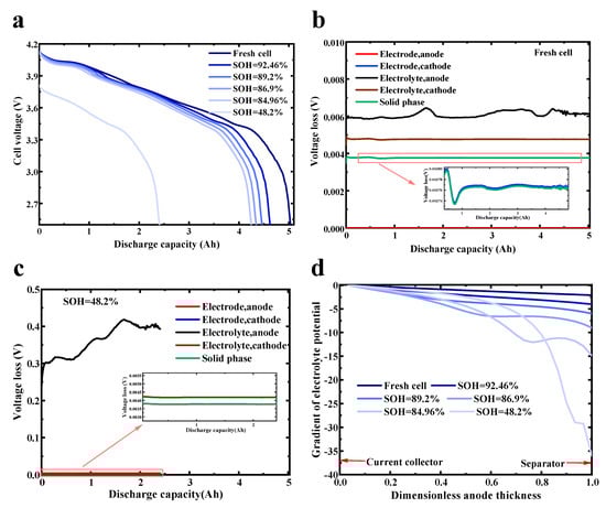 Characteristic analysis of battery potential at an SOC range of [45%–95%]: (a) Discharge voltage at 0.3 C under different SOHs. (b) Voltage loss caused by different components for a fresh cell. (c) Voltage loss caused by different components for an aged cell. (d) Gradient of electrolyte potential across the anode thickness under different SOHs.