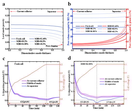 Distributions of local anode porosity (a) and pore volume occupation by SEI and li plating (b) under different SOHs. Variations in li deposition potential during charging at different sites for a fresh cell (c) and an aged cell (d).