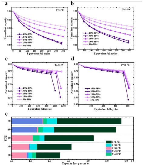 Capacity degradation under different SOC swing ranges with a DOD of 50% under temperatures of (a) T = 5 °C, (b) DOD = 15 °C, (c) T = 35 °C, (d) T = 45 °C, (e) Capacity loss per cycle under different temperatures and values.