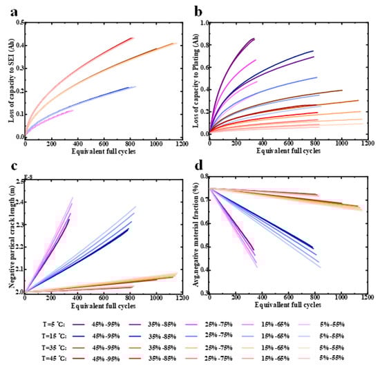 Figure 9 shows the battery aging characteristics at 50% DOD and different aging characteristics. Figure 9a shows the battery capacity loss caused by SEI, which indicates that the SOC cycling range was limited while the temperature had a greater effect on the SEI layer growth. For example, the capacity loss due to SEI at 45 °C was approximately three times that at 5 °C for the same EFCs. The high SEI growth rate at high temperatures was due to the increased intercalation capability of solvent molecules at elevated temperature rises, which was indicated by an increase in the solvent diffusion coefficient of Equation (5). Figure 9b depicts the battery capacity loss due to li plating. As shown in Figure 9b, lithium plating was highly sensitive to both the SOC cycling ranges and temperatures. For instance, at the same EFCs, the battery capacity loss caused by lithium plating at 5 °C was four times that at 45 °C, indicating that low temperatures facilitated li plating. The reason for this was that the graphite anode kinetics deteriorated as the temperature decreased. That is, on the one hand, the li-ion intercalation rate into the negative electrode was reduced at low temperatures, resulting in the intensified polarization of the negative electrode electrolyte, and many li-ions directly obtained electrons at the negative electrode/electrolyte interface and became metallic lithium directly. On the other hand, at lower temperatures, the SEI layer growth was slower, which promoted the formation of dead Li (Equation (11)). Figure 9a,b shows that at low temperatures, li plating was the main aging mechanism, and the SEI layer growth caused less battery capacity loss than li plating.