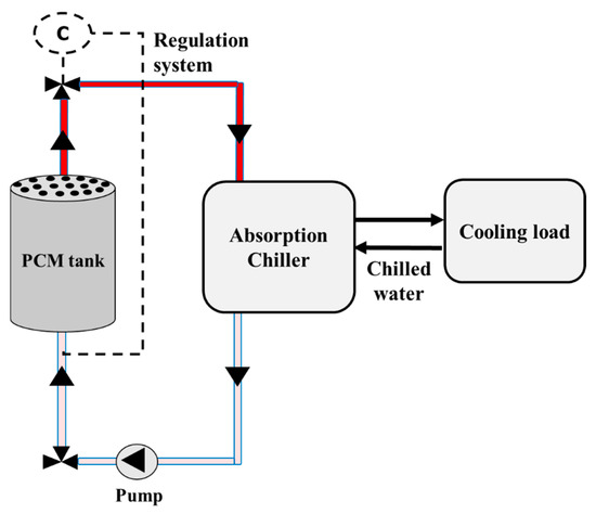During this period (off/low-sunshine hours), the solar field is defocused and the circulation of the HTF in the PTC is stopped. The schematic of the operated system during this period is illustrated in Figure 2. The PCM tank is used as the heat source to extend the functioning of the absorption chiller during this period and therefore continue the cooling process using the stored thermal energy. It is important to note that the stored thermal energy will be used to cover only a part of the required thermal energy for the cooling process and will thus reduce the energy consumption of the absorption chiller. During this process, both sensible and latent heat stored in the tank are released and the PCM changes its phase from liquid state to solid state. This thermal energy is recovered by the HTF and then passed through the chiller generator for chilled water production. If the storage tank is fully discharged (complete solidification of the PCM) and the produced HTF temperature is not sufficient to drive the chiller machine, the absorption machine auxiliary heater is turned on and the required additional heat is produced for the cooling process. Through this operation strategy, the absorption chiller energy consumption will be minimal, and its energy efficiency will be improved.