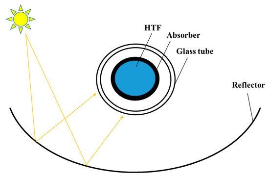 This concentrated type of solar collector (PTC) is able to produce HTF temperatures in the range of 60–300 °C with high thermal efficiency compared to traditional flat plate and evacuated tube solar collectors [20,21,22,23]. This type of solar collector is chosen in this work due to its suitable temperature range for supplying the necessary thermal energy to drive the chiller generator and to ensure a complete charging process of the PCM tank with high phase transition temperatures (higher than 100 °C). In fact, using traditional flat plate collectors leads to the production of low HTF temperatures, i.e., between 30 and 80 °C, which is not suitable for double-effect solar absorption chillers (See Table 1). The used PTC in the present study is able to produce the needed HTF temperature range (110 °C to 170 °C), and it contains a reflected mirror, a receiver tube and a sun-tracking unit. The characteristics of the commercial PTC (Eurotrough ET-150 [24]) used in this work are given in Table 2. During the functioning of this solar collector, the received direct normal irradiation is first reflected and then absorbed by the receiver tube. The absorbed heat is then transferred by conduction and by convection to the HTF (pressurized water) and this leads to an increase in its temperature. A cross-section of the used PTC is illustrated in Figure 3.