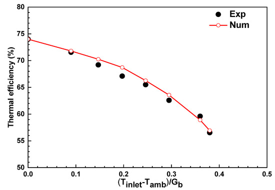 Variation of numerical and experimental PTC thermal efficiency from [26,27].