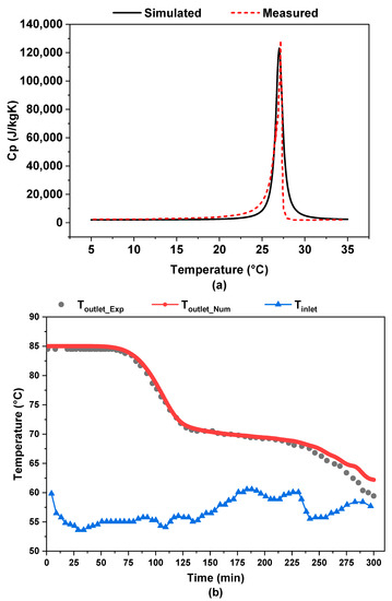 To ensure the validity of both the PCM modeling approach and the PCM tank dynamic global model, obtained results were compared with experimental results from the literature [35,36,38]. Medved et al. [35] have experimentally measured the variation of the PCM heat capacity with the temperature. The same design and operation conditions were used as input parameters in the developed EES code, and the obtained results were compared with measured data. Figure 6a shows the variation of the PCM heat capacity with the temperature using the developed model and measured data from the reference [35]. This result indicates that the proposed approach can estimate with good accuracy the PCM heat capacity variation in both the sensible heat transfer domain (constant low values of Cp) and the latent heat transfer domain (a jump of Cp with T). This validated PCM heat capacity function is used in the PCM tank model, and the simulation results were compared with real-scale shell-and-tube PCM tank measurements [38]. The present PCM tank has the same used design in the experimental work of [33] where it is used to provide hot water for a district heating substation in France. More details about this study could be found in our previously published works [34,39]. By using the same previous validation methodology, obtained results from the proposed dynamic model were compared with the experimental measurements, and the obtained results are given in Figure 6b. By analyzing this result, it can be seen that the PCM tank model predicts with acceptable accuracy the real dynamic thermal behavior of the storage system. The maximum relative error is equal to 5%. In fact, the produced water temperature from the PCM tank model follows the measured one, where it decreases until reaching the phase transition period. During this period, both the simulated and the measured outlet water temperatures become stable due to the high amount of produced latent thermal energy from the PCM. At the end of the phase change process, the water temperature drops, and only sensible thermal energy is released.