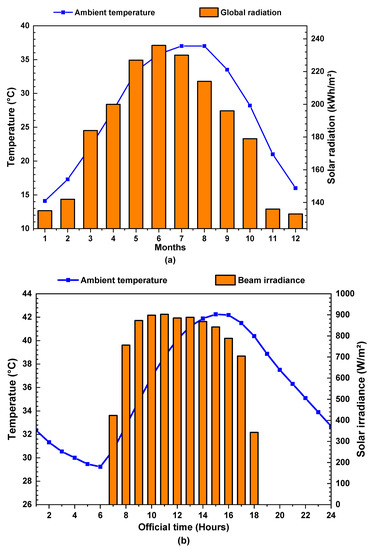 (a) Monthly variation and (b) hourly variation of ambient temperature and solar radiation in Riyadh (Saudi Arabia).