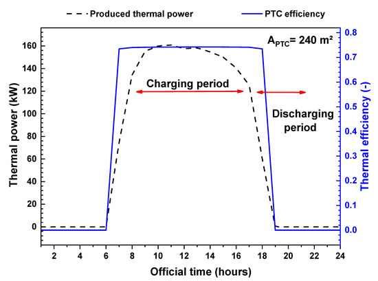 By using these previous meteorological data of the representative summer day, the variation of the produced solar thermal power from the PTC field is presented in Figure 8. It can be seen that the solar PTC field is able to provide the necessary thermal energy for driving the chiller generator. In fact, the produced solar thermal energy follows the solar irradiance behavior and reaches a value higher than 120 kW (necessary thermal energy for the cooling process) from 9 a.m. to 5 p.m. During this period, the PCM tank can be used as a thermal battery for the storage of excess produced solar thermal energy and to maintain a stable operation of the solar cooling process. During the early morning or in the late afternoon, this stored thermal energy in the PCM tank will be used when the produced solar thermal power is insufficient (lower than 120 kW) to meet the cooling power demand. Figure 8 shows also the hourly variation of the PTC solar field thermal efficiency. During sunshine hours, the PTC thermal efficiency varies between 73% and 74% as the received solar energy is lost due to the reflection coefficient of the PTC mirror and the convection heat losses between the PTC receiver and the exterior air.