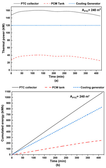 Instantaneous thermal power (a) and cumulated thermal energy (b): produced by the PTC, stored in the PCM tank and used by the chiller generator for the cooling process.