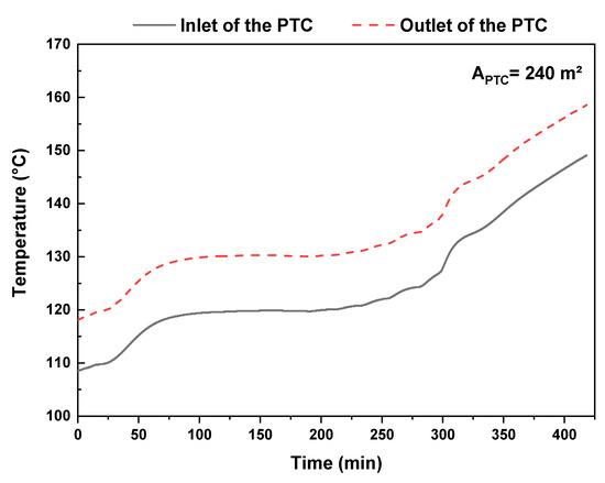 The dynamic behavior of the coupled PTC solar field and PCM tank with the double-effect absorption chiller is presented in this section. Figure 11 illustrates the time-wise evolution of the HTF temperature at the inlet and the outlet of the PTC solar field. This period is assumed from 9:00 a.m. to 5:00 p.m., and the used ambient temperature and received beam radiation are given in Figure 7b. It can be seen that the difference between the HTF inlet and outlet temperatures is about 10.5 °C with a mass flow rate of 13.2 m3/h; this is a 160-kW solar concentrator thermal power. The HTF temperature at the inlet of the PTC, coming from the PCM tank and the double-effect chiller, increases at the beginning of the system operation before it reaches a stable value of around 118 °C. In fact, the produced hot HTF passes simultaneously through the PCM tank and the chiller generator which leads to a decrease in its temperature. When the PCM melting process starts (at a melting point between 117–119 °C), the HTF inlet temperature stabilizes around this melting point due to the latent heat storage process. After completing the phase process, the HTF temperature at the outlet of the PTC increases and reaches its maximal value of 160 °C. It is interesting to note that the used 160-kW PTC is advantageous for the solar-powered double-effect chiller as the PTC allows the chiller to reach suitable operation temperatures (110–170 °C) during the whole cooling period and also to complete the PCM charging process.