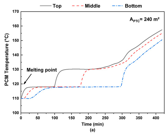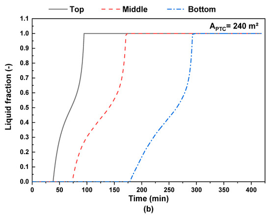 To verify if the PCM tank is completely charged or not (storage process), the variation of PCM temperature at three different locations inside the tank, i.e., top, middle and bottom, is given in Figure 12a. It is interesting to note that the PCM tank is coupled to the solar field and thus the same previous design and operation are used. These results indicate that the PCM temperature at different locations follows the same behavior. At the beginning of the charging operation, the temperature increases until reaching the melting interval (117–119 °C). During this period, only the sensible heat is stored in the tank by increasing the PCM temperature level. When the PCM temperature reaches the melting point, the latent heat storage process starts at a nearly constant temperature. It is interesting to note that the charging process is carried out from the top to the bottom of the PCM tank, which is translated into a rapid increase in the PCM temperature at the top compared to the bottom. Another important parameter during the latent heat storage process is the PCM liquid fraction, which indicates the progress of the physical phase change process (Figure 12b). As the PCM at the top of the tank is the closest to the hot HTF, its liquid fraction increases quickly compared to other locations, and it reaches a value of 1 (complete charging) after only about 100 min from the beginning of the charging process. However, the PCM located at the bottom of the tank needs about 300 min to become liquid, thus completing the charging process. Overall, the proposed solar-powered system is able to completely charge the PCM tank as all of the PCM becomes liquid during the charging and cooling operation, and therefore both sensible and latent heat is stored in the tank for later use.