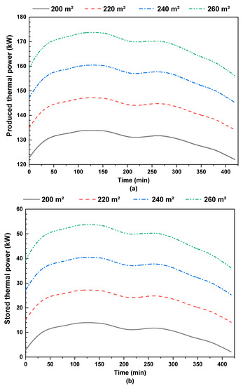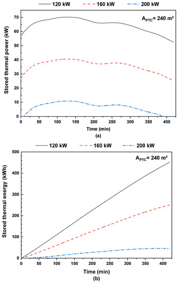 To evaluate the influence of the used PTC solar field area on the charging operation, four different PTC areas were used in the developed dynamic model: 200 m2, 220 m2, 240 m2 and 260 m2. Figure 13a shows the evolution of instantaneously produced solar thermal power from the PTC during the functioning of the coupled PTC–PCM tank-chiller. As expected, increasing the PTC area from 200 m2 to 260 m2 leads to an increase in the amount of produced thermal power, and its maximal value varies from 134 kW to 174 kW. The effect of the chosen PTC area on the stored thermal energy is clearly indicated in Figure 13b. It can be seen that reducing the used PTC area leads to a reduction in the amount of stored thermal power in the PCM tank. In fact, the role of the proposed PCM tank is to store only the excess of the produced thermal power. As the necessary thermal power to drive the chiller generator is fixed at 120 kW, minimal stored thermal power is observed for a lower solar PTC field area. The maximal stored thermal power in the PCM tank is equal to 14 kW, 27 kW, 40,5 kW and 54 kW for a PTC area of 200 m2, 220 m2, 240 m2 and 260 m2, respectively.