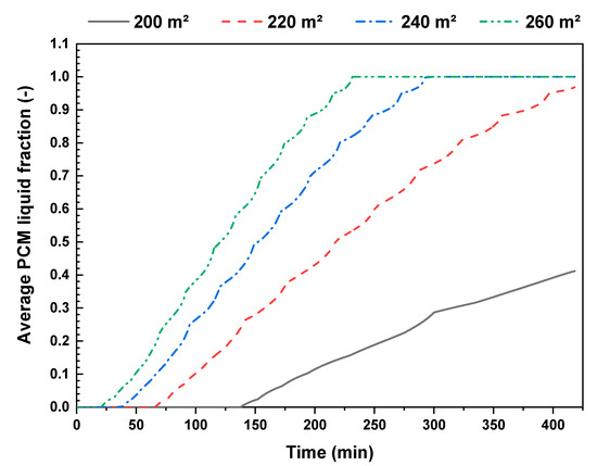 Variation of average PCM liquid fraction during the charging and cooling operation for different PTC field areas.