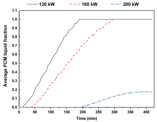 To verify the state of the charging process in the PCM tank, the average PCM liquid fraction at the tank for each cooling power demand is given in Figure 16. It is observed that for all cases, the liquid fraction is equal to zero at the beginning of the charging process which is translated by the sensible heat storage process without change in the PCM physical state. When the PCM temperature reaches the melting interval, the latent heat storage process starts, and the liquid fraction increases. It can be seen that for 120 kW and 160 kW cooling power demand cases, the charging process in the PCM tank is completed, i.e., a liquid fraction equal to 1. The time needed for the charging process is increased by about 64% as the cooling power demand increases from 120 kW to 160 kW. However, for a higher value of cooling power of 200 kW, the use of the present PCM tank is not beneficial as its melting fraction does not exceed 10% and thus its charging process is not completed.