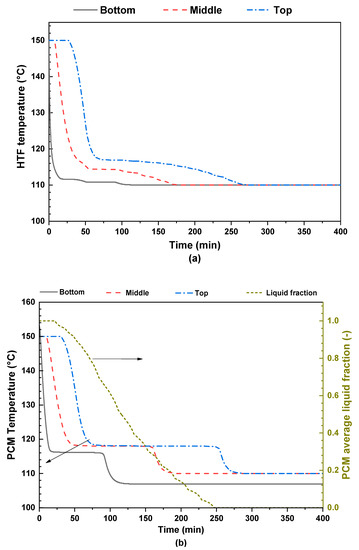The functioning of the coupled PCM tank and absorption chiller is analyzed in this section, and the potential for using the PCM tank to deliver a part of the necessary thermal energy for driving the chiller generator during the discharging period is investigated. As in the charging period, the cooling power load is fixed at 160 kW and thus the required thermal power to drive the chiller generator is equal to 120 kW (COP = 1.33). This cooling load is assumed to be consumed during the nighttime period for 6 hrs, i.e., from 6:00 p.m. to 11:00 p.m. The main role of the proposed PCM tank is to deliver stored renewable solar thermal power and thus reduce the chiller energy consumption during the nighttime period. The storage system is designed to deliver constant thermal power during the discharging period through the regulation of the HTF mass flow rate. For this purpose, the used pump flow rate is regulated, and it has a minimal mass flow rate of 0.2 kg/s and a maximal one of 1.58 kg/s [33,34]. Initially, the PCM tank is assumed to be charged at a liquid state with an initial temperature of 150 °C (See Section 4.2). If the released thermal power from the PCM is not sufficient to drive the chiller generator, the chiller auxiliary heater will be turned on to deliver additional heat. Figure 17a shows the variation of the HTF temperature at different locations in the PCM tank during the discharging period. It is interesting to note that the discharging process is carried out from the bottom to the top, and the return temperature from the chiller generator is fixed at 110 °C. It can be seen that the HTF temperature increases from the bottom to the top of the tank due to the released thermal energy from the PCM. At the beginning of the discharging period, the HTF outlet temperature (top of the tank) remains constant at 150 °C for about 50 min due to the stored sensible heat in the PCM. After this period, the outlet HTF temperature drops, and it reaches the second plateau where it becomes stable at around 118 °C. This temperature stabilization is advantageous for the chiller operation in stable conditions. During this period, the phase change process of PCM starts and leads to the production of a constant HTF temperature close to the melting interval of the used PCM [117–119 °C] (Figure 17b). At the end of the discharging period, both the outlet HTF temperature and the PCM temperatures at the top of the tank become equal to the inlet temperature (bottom), and the PCM liquid fraction is equal to zero (Figure 17b) (PCM at solid-state).